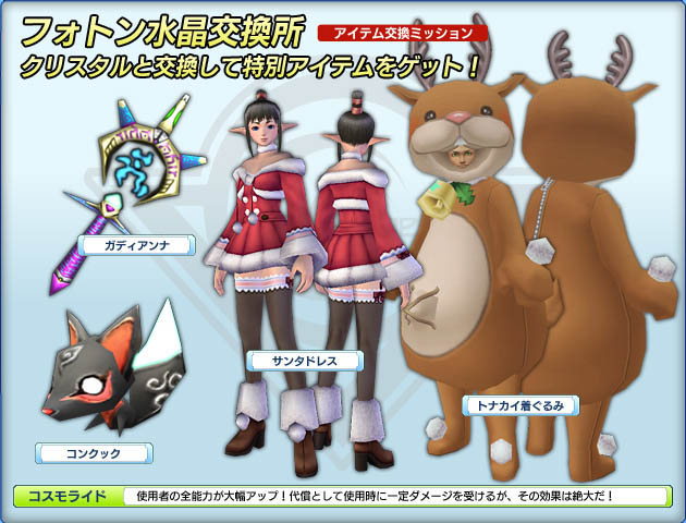 今日は、フォトン水晶交換所にサンタドレスとトナカイ着ぐるみが再配信ですねw